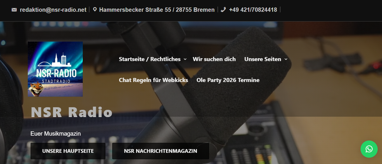 NSR Radio ist ein moderner Radiosender aus Bremen, der sich auf die Moderation von Musik und Unterhaltung spezialisiert hat. Wir bieten ein vielfältiges Programm für alle Hörerinnen und Hörer und sorgen für gute Laune und beste Unterhaltung. Schalten Sie ein und lassen Sie sich von uns begeistern!