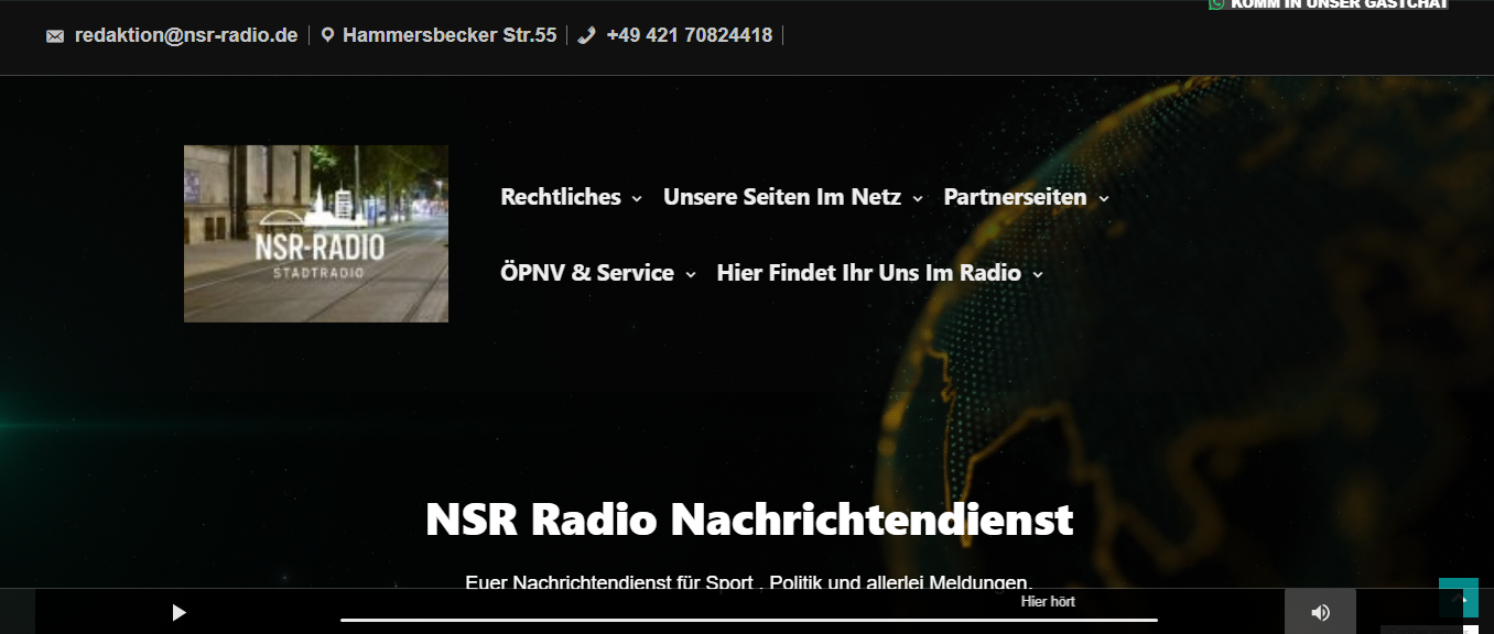 NSR Radio ist ein Radiosender mit Sitz in der schönen Stadt Bremen. Wir sind spezialisiert auf Moderation und bieten unseren Hörern ein vielfältiges Programm aus Musik, Nachrichten und Unterhaltung. Unsere Moderatoren sind bestens ausgebildet und stehen für Qualität und Professionalität. Sie informieren Sie nicht nur über aktuelle Geschehnisse, sondern sorgen auch für gute Laune und unterhaltsame Beiträge. Wir sind stolz darauf, ein Teil der lokalen Medienlandschaft in Bremen zu sein und möchten unseren Hörern ein abwechslungsreiches und ansprechendes Angebot bieten.